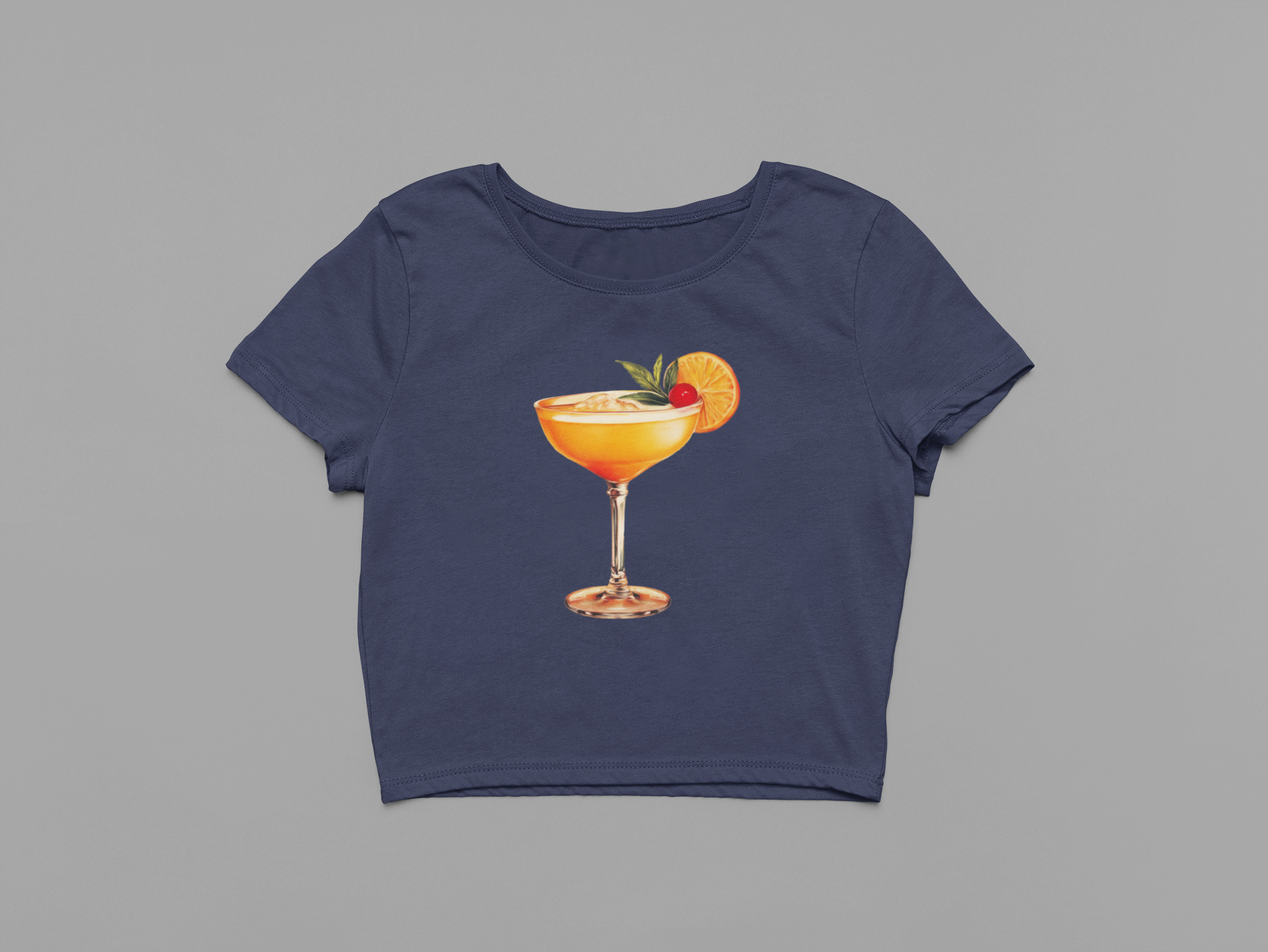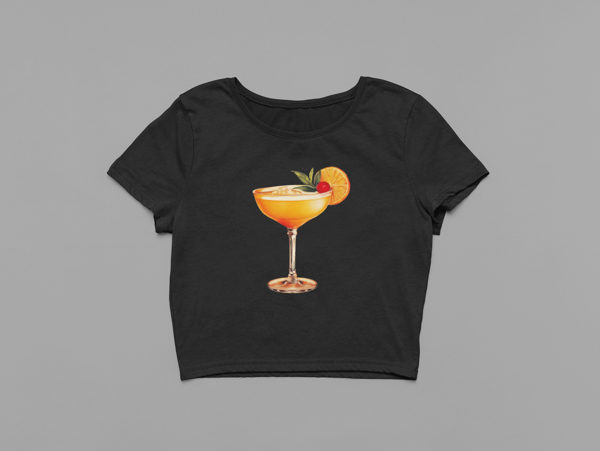 Bring the summer vibe wherever you go with our “Tropical Mood” Crop T-Shirt — a bold and refreshing statement piece for every fashion-forward soul. Featuring a vibrant orange cocktail in a vintage coupe glass, complete with an orange slice, cherry garnish, and basil leaves, this design radiates tropical glam and sunset energy.