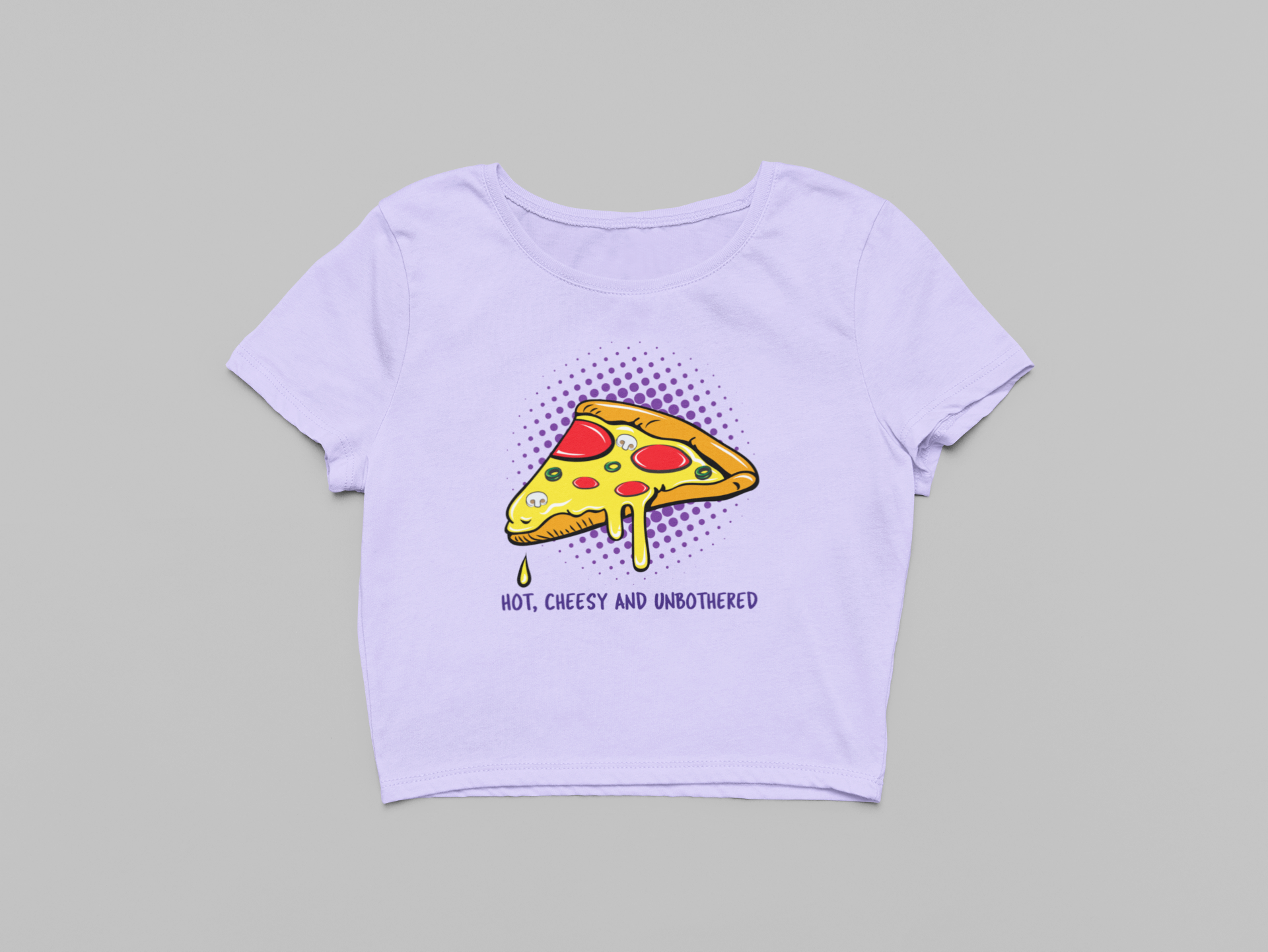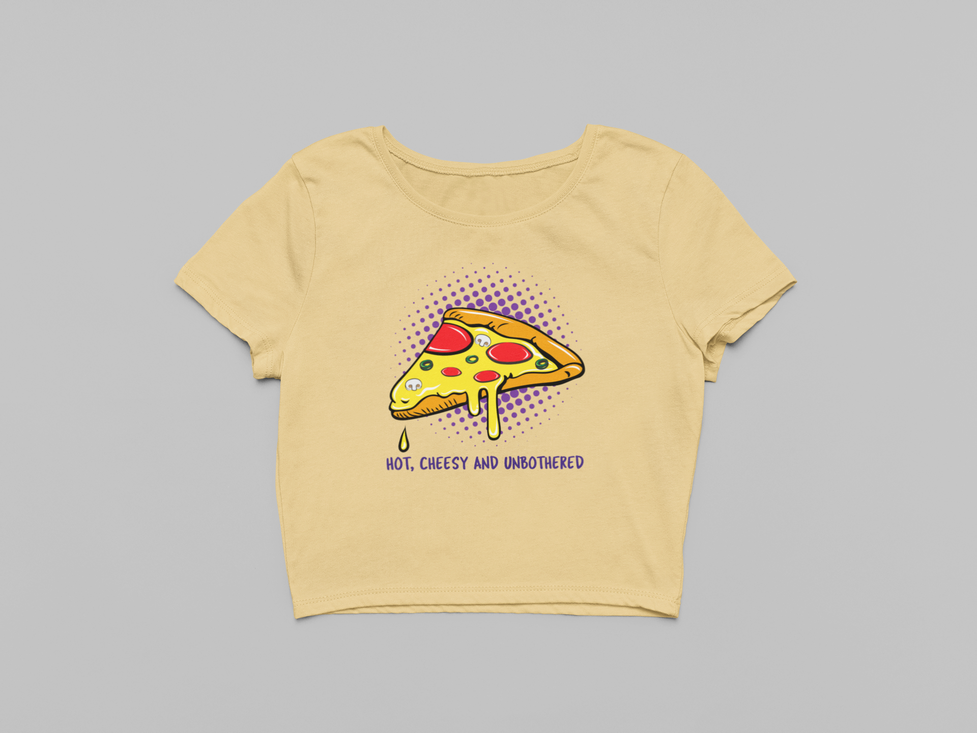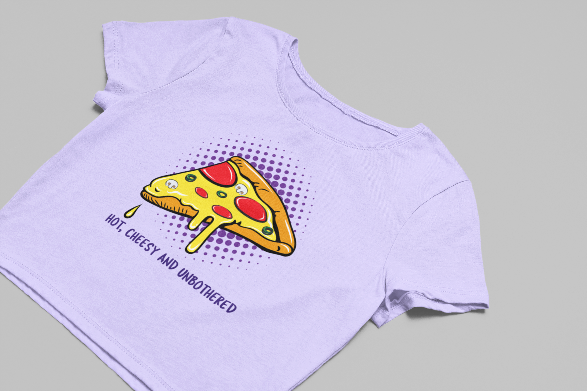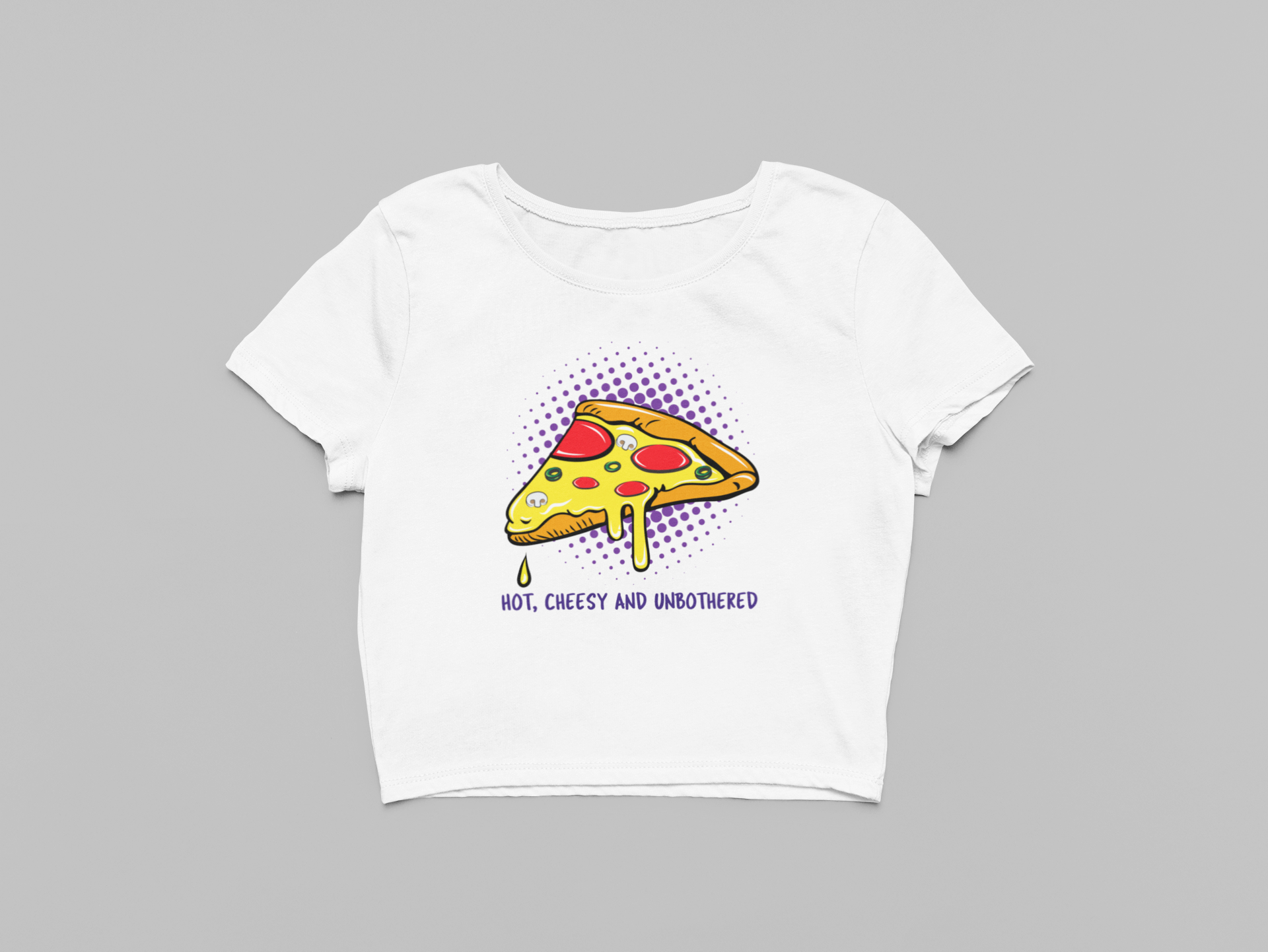 Serve attitude with a side of cheese! Our “Hot, Cheesy & Unbothered” women’s crop t-shirt is a playful nod to self-confidence and late-night pizza cravings. Featuring a bold, pop-art inspired dripping pizza graphic and a cheeky slogan, this tee is made for girls who are unapologetically themselves — fun, fiery, and totally unbothered.