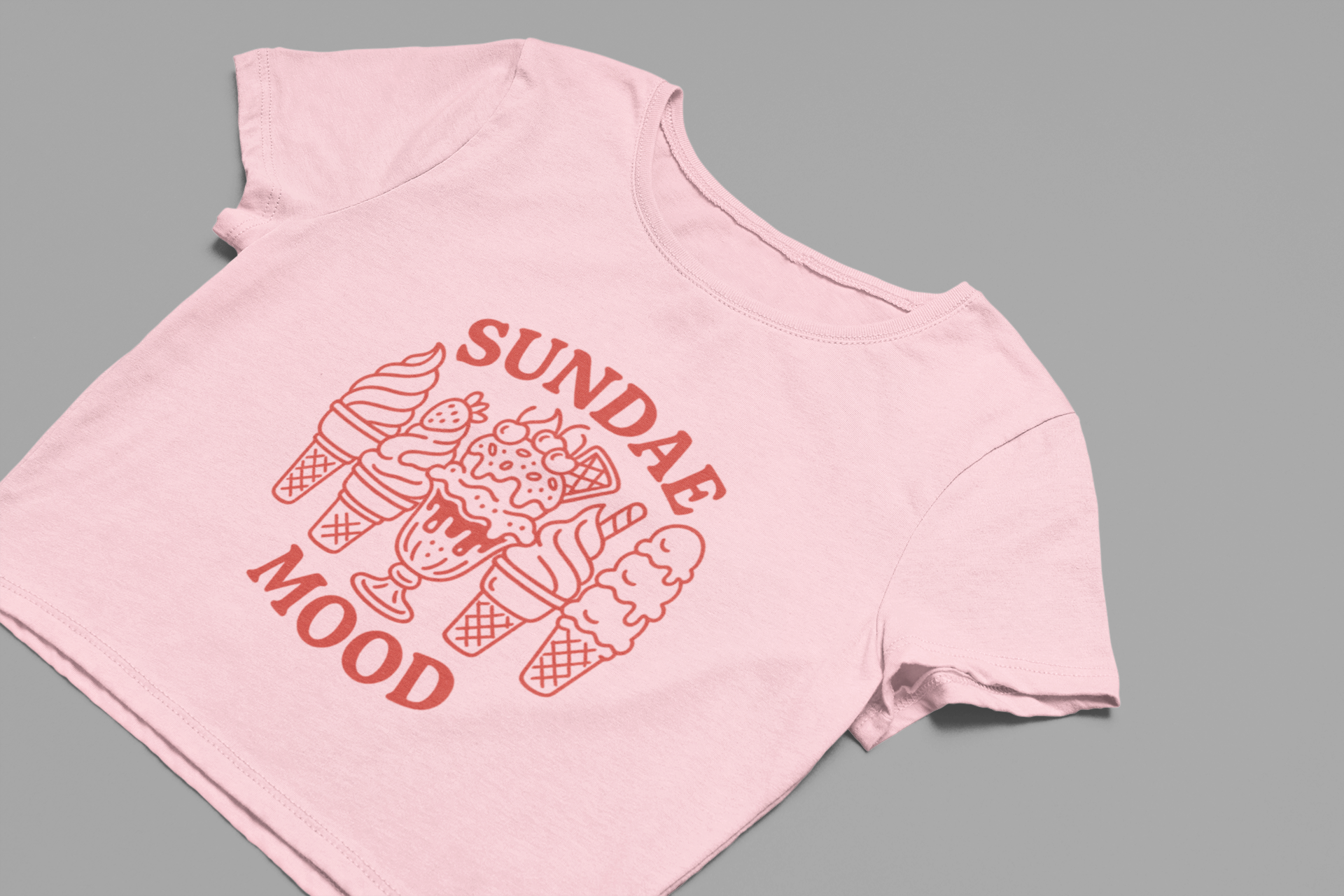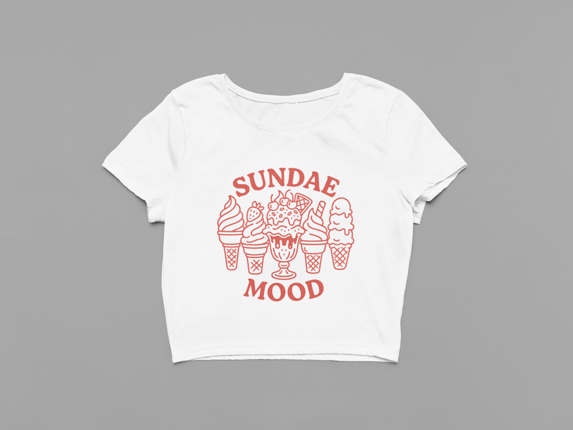 Indulge in the sweetest vibe of the season with our “Sundae Mood” crop top — a playful blend of vintage dessert art and Y2K charm. This adorable design features five detailed ice cream treats in a clean red line-art style, with the bold hand-drawn text “SUNDAE MOOD” adding a fun, retro touch.