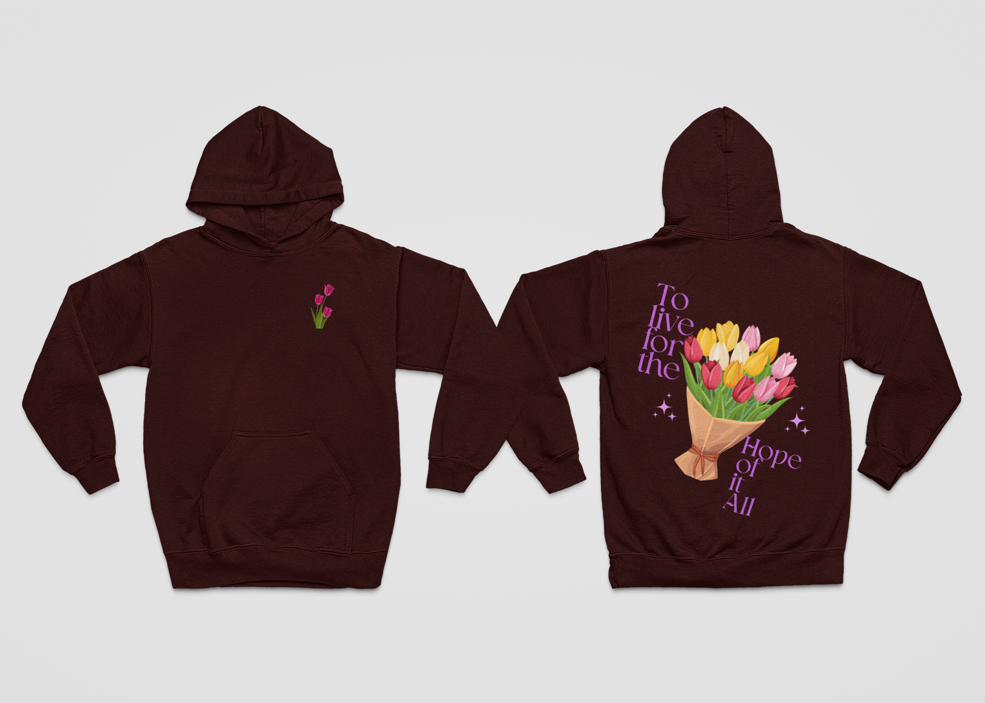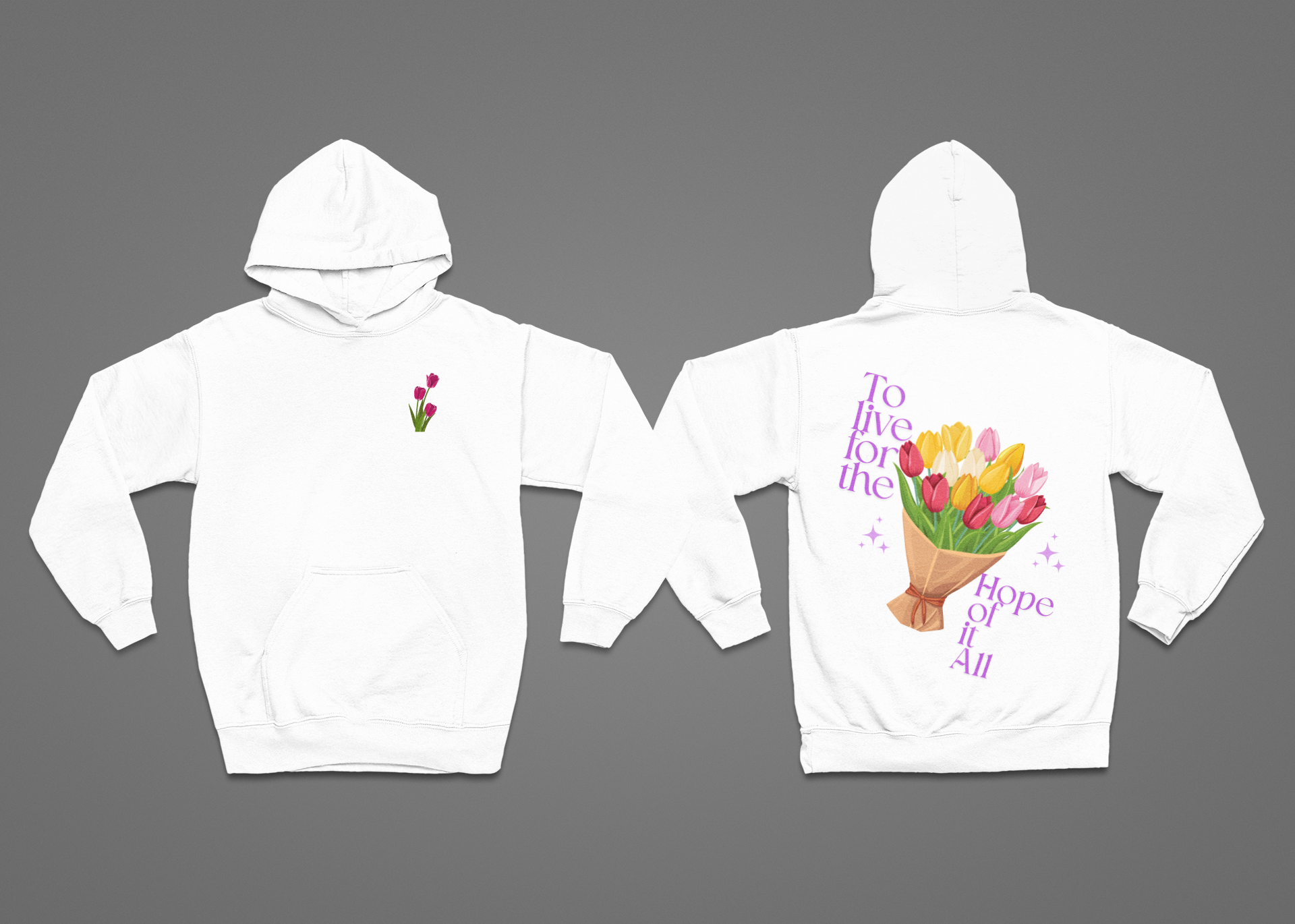 Wrap yourself in comfort and meaning with this beautifully designed oversized hoodie featuring vibrant tulip artwork. The front design showcases three bold, pink tulips—minimal, clean, and modern—perfect for a soft yet stylish everyday look. The back print features a stunning, colorful bouquet of tulips surrounded by the inspirational quote “To live for the hope of it all”, arranged in a playful, aesthetic layout that instantly elevates your outfit.